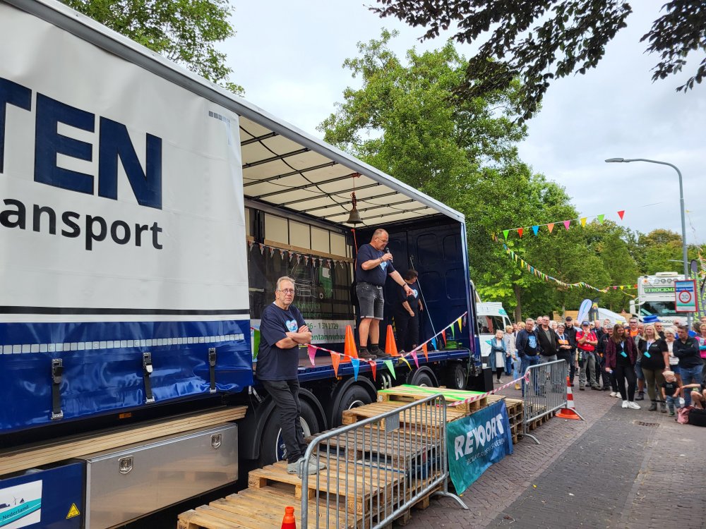 Op de podiumtruck neemt organisator Johannes het woord voor de briefing. Ook maakt hij bekend dat er maar liefst 17.500 euro is ingezameld voor het goede doel.