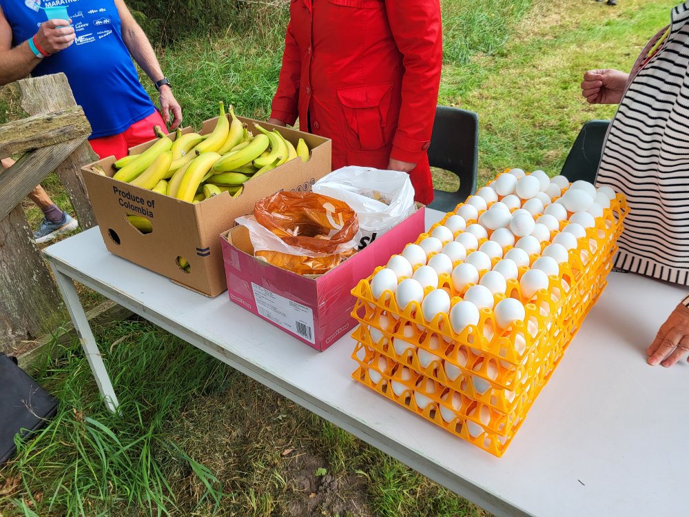 Bij het Voedselbos Ter Wupping worden we getrakteerd op bananen, winegums en gekookte eieren. In eieren heb ik niet zo’n zin, maar de rest gaat prima naar binnen.