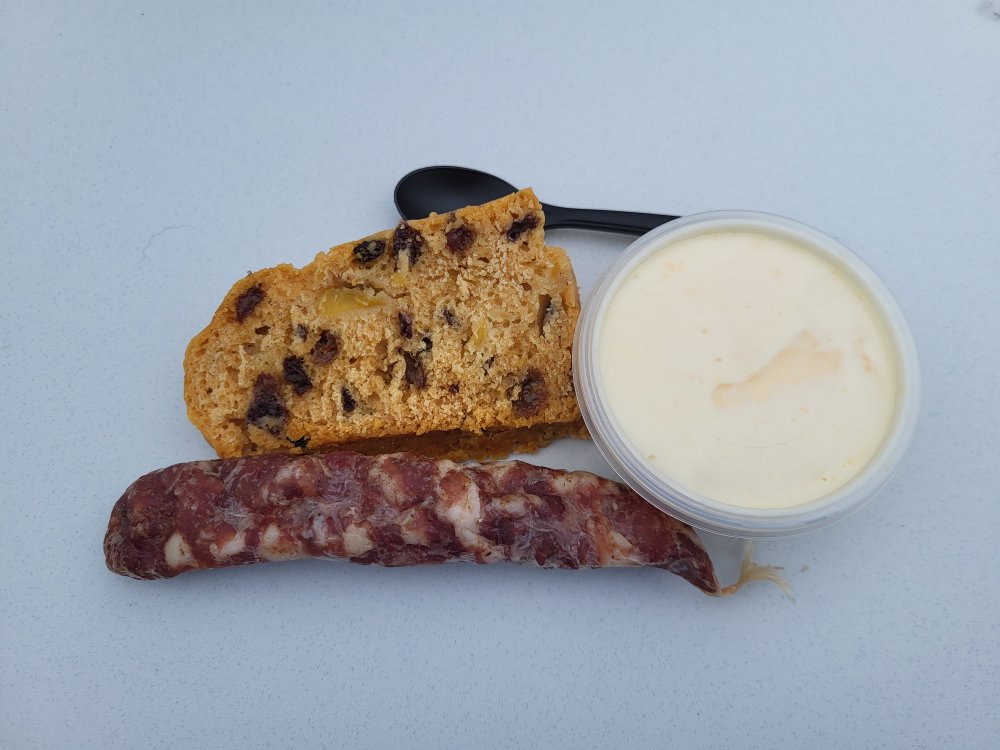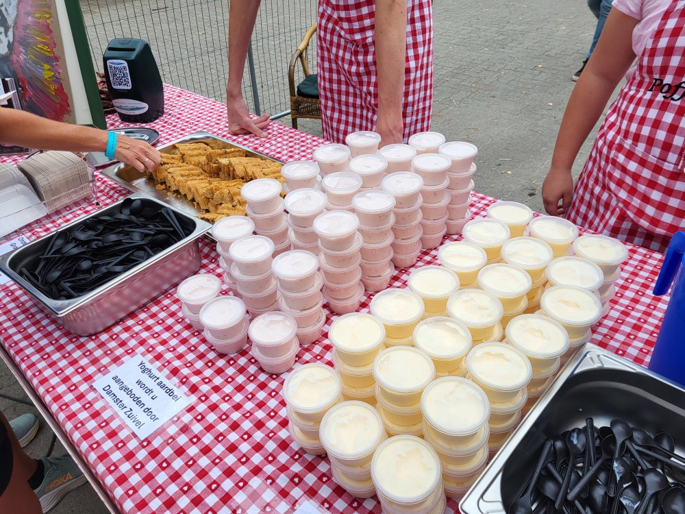 Vruchtenyoghurt, poffert en metworst.