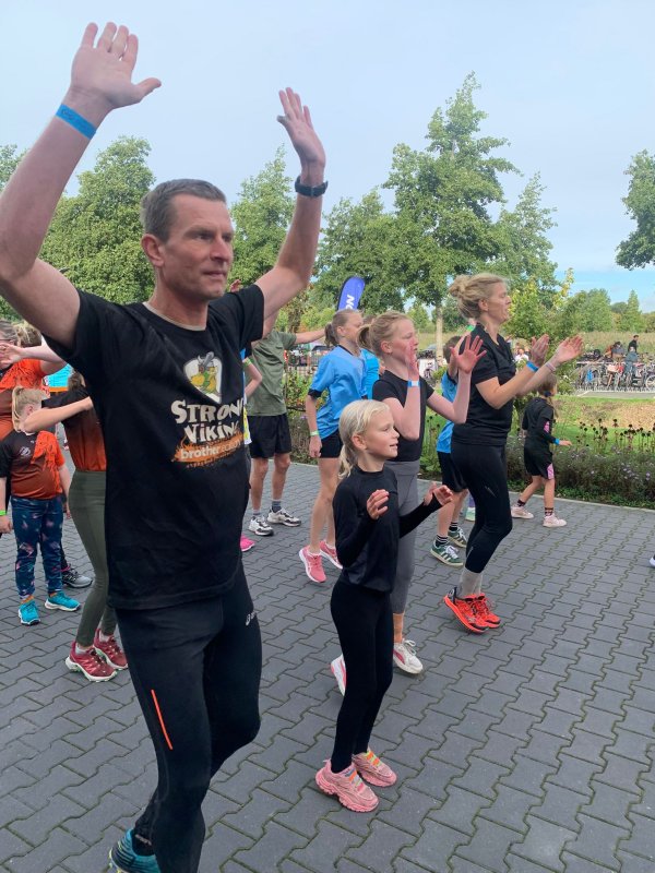 Op zondagmorgen zetten we koers naar Kardinge voor de FamilieRun. We geven onze spullen af bij de garderobe en begeven we ons naar het startvak voor een uitgebreide warming-up. Daar gaan we los.