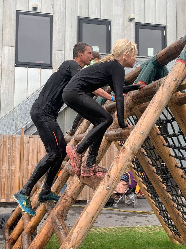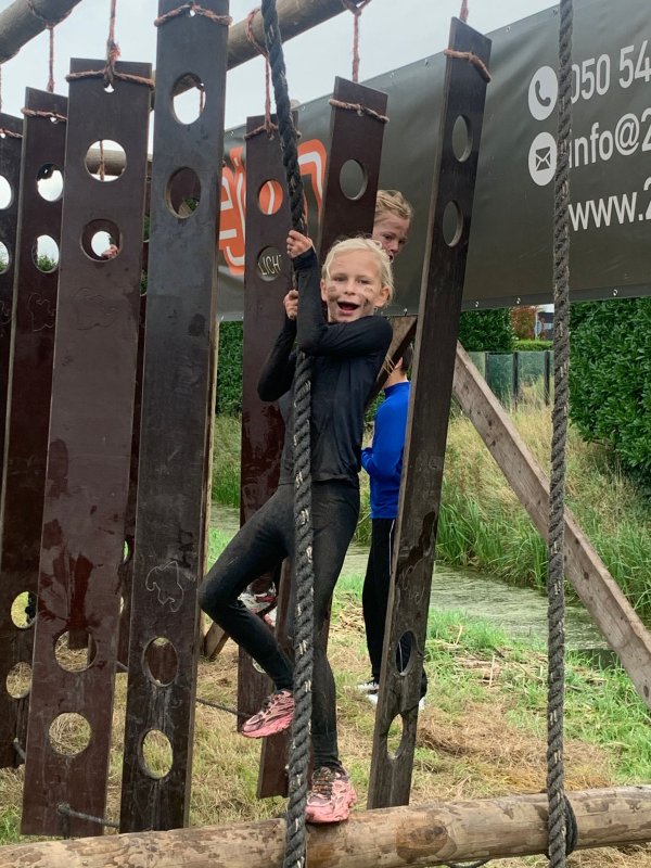 We kruipen onder het podium door en steken de sloot over via pontons. Na de monkeybars gaan we verderop voor het eerst te water. Dat is fris, maar de watertemperatuur valt me mee. Na een obstakel van strobalen beklimmen we de Kardingebult voor de eerste keer en waden we beneden een lang stuk door het water. Bij de waterpost zijn we halverwege. Mijn zoon en zijn vriendje nemen iets verderop de afslag naar de route van de 8 kilometer, terwijl wij verder rennen over het parcours van de 4 kilometer.