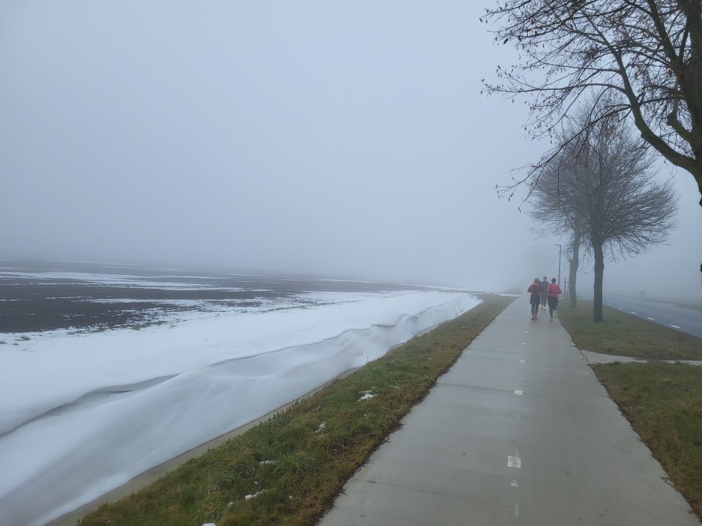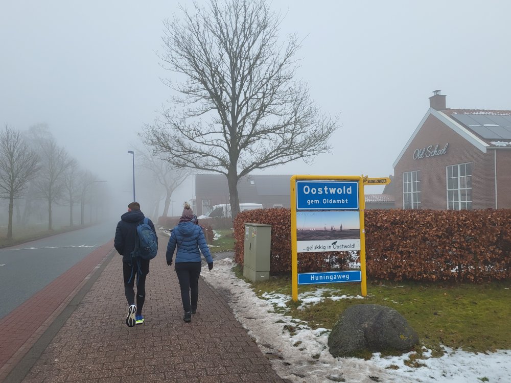 De omstandigheden in het besneeuwde en mistige Oldambt zijn weliswaar winters, maar qua blaauwbekken valt het wel mee. Via Nieuw-Beerta, Beerta en Reiderwolde bereiken we na zo’n zeventien kilometers de oevers van het Oldambtmeer. Vanwege de dichte mist zien we weinig van het meer zelf. Precies op de helft lopen we een lusje langs de sporthal in Oostwold.